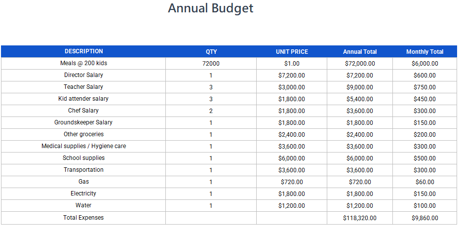 The budget below reflects our ideal state of monthly operations. As of this writing, our monthly recurring donations are well below this amount. On the heels of the Covid-19 pandemic, we have struggled from month-to-month to find a way to keep going. With your generous support, we can change that and make sure the children are fully supported. Once these fundraising goals are met, we can consider necessary spending on infrastructure improvements.